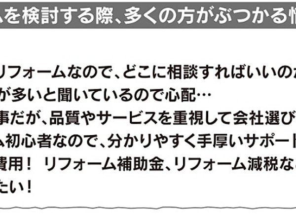 リフォームをされた方の声を聞いてみると相見積もりをとって最終的に断る際に精神的に疲れてストレスになった見積もり内容と工事が違った工事開始後に追加見積が発生した工事終了後にリフォーム補助金のことを知ったなどなどの声が少なくありません。高い費用をかけて大事な我家をリフォームするので…